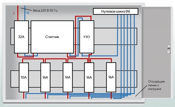 - Вводной автомат или рубильник: Обычно размещается в верхнем левом углу.